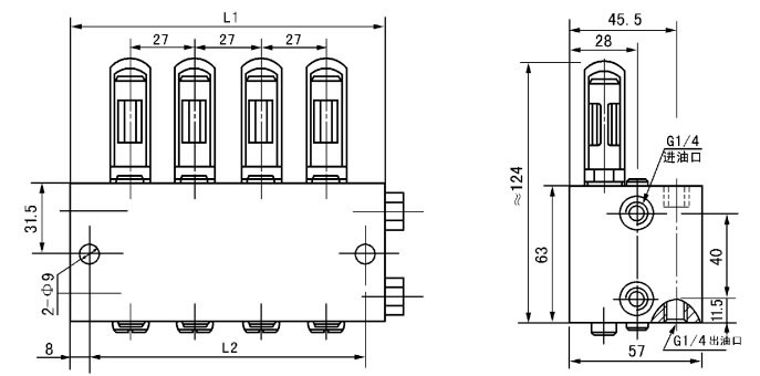 分配器適用于公稱壓力為40MPa的雙線式干油集中潤滑系統(tǒng)中。它在兩條供油主管交替的供油壓力作用下,直接由供油壓力控制活塞動作給油,完成向潤滑點(diǎn)定量分配潤滑脂的功能。
