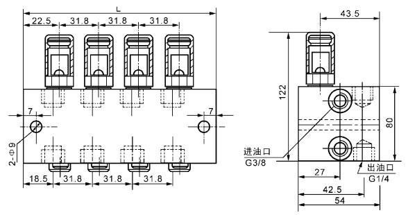 若需相應(yīng)上下出口合并時,只要將孔內(nèi)的螺釘擰出,把上或下不用的那個出油口用G1/4螺塞封堵以防灰塵侵入。