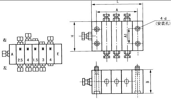 | 說明:遞進分配器的組合按進油口元件首塊A、工作塊M和尾塊E、從左到右排列,在隊列下方出口稱為左,在隊列上方出口稱為右。如圖 |