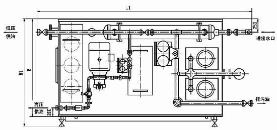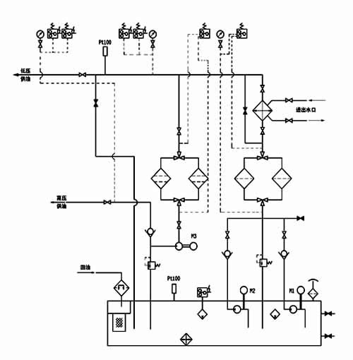 本油站為整體式,由油箱、兩臺(tái)低壓油泵、一臺(tái)高壓油泵、二臺(tái)雙筒網(wǎng)片式過(guò)濾器、回油磁網(wǎng)過(guò)濾裝置、列管式油冷卻器、各種控制閥門(mén)、管道以及電接點(diǎn)壓力表、鉑熱電阻等組成。