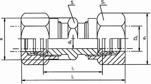 公稱壓力J級,管子外徑D0為14mm的卡套對接直通管接頭: