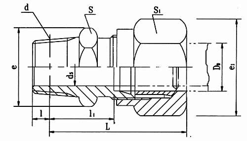 公稱壓力E級(jí),管子外徑D0為14mm的卡套式錐螺紋直通管接頭: